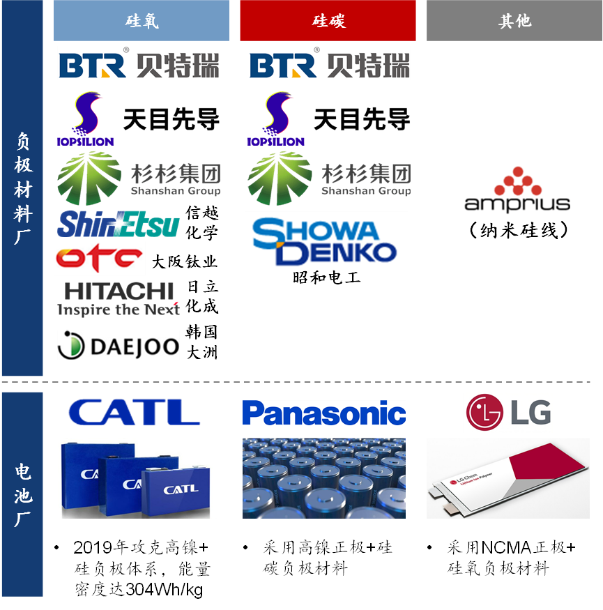 硅基材料正处在规模化应用的前夕,目前负极材料公司如贝特瑞、杉杉、天目先导都规划了万吨级的产线,松下、LG、宁德时代等电池厂也推出了搭配硅基负极体系的电池产品,预计能够很快推向市场。特斯拉已经率先将硅碳负极应用于Model 3,在人造石墨负极中加入10%的硅氧材料,使得单体电池能量密度达300Wh/kg。