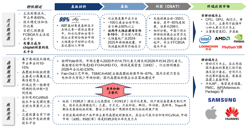 因为技术方案的差异,利用基板的封装方案发展的最早,成本结构和产业链发展较为成熟,但基板厚度和功耗较高的问题无法满足移动端芯片的封装需求,因此以FCBGA为代表的的芯片级封装方案成为了大算力xPU的主要封装技术平台。晶圆级和板级封装利用更薄更紧密集成的优势,是移动端芯片的主战场。